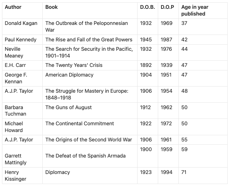 WALKER: So the oldest author was Kissinger. He was 71 when Diplomacy was published. The youngest was Kagan. He was 37 when The Outbreak of the Peloponnesian War was published.