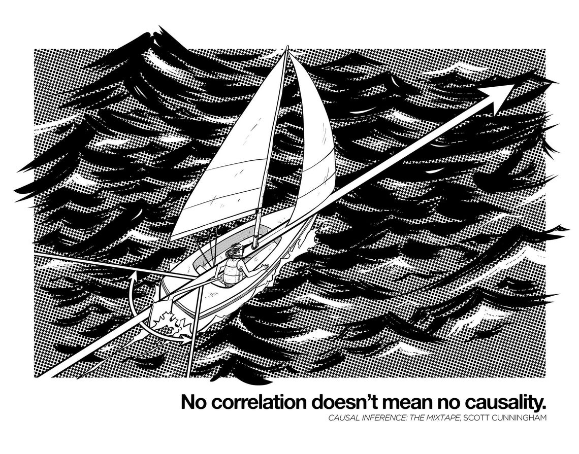 9. Daniel Kahneman has responded to criticism of the claim made in his new book Noise that causation implies correlation, on Andrew Gelman's blog. And below is a picture from Scott Cunningham's book Causal Inference: The Mixtapeillustrating why causation need not imply correlation.