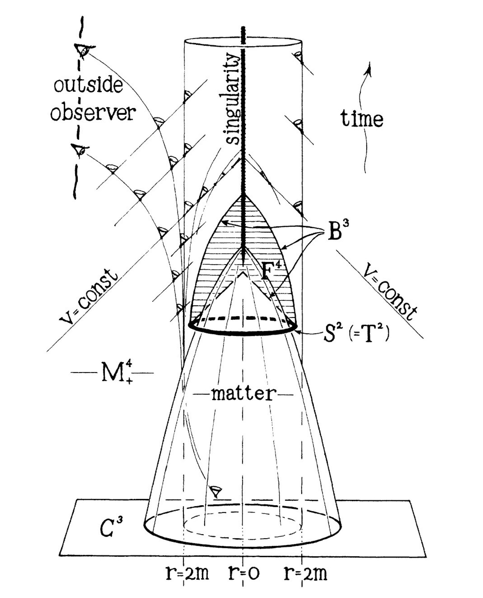 3. If a picture says a thousand words, few have said so complicated a set of (roughly) one thousand words as the drawing below. It comes from the hand of Sir Roger Penrose and distils the proof in his succinct, 3-page paper 'Gravitational Collapse and Space-Time Singularities'. The paper, published in 1965, won him the Nobel Prize in Physics last year. Defying prevailing skepticism, Penrose proved that if a star implodes beyond a certain point, nothing can prevent the gravitational field getting so strong that the star collapses into a singularity. In other words, he threw open the gates to the possibility of black holes in the universe.