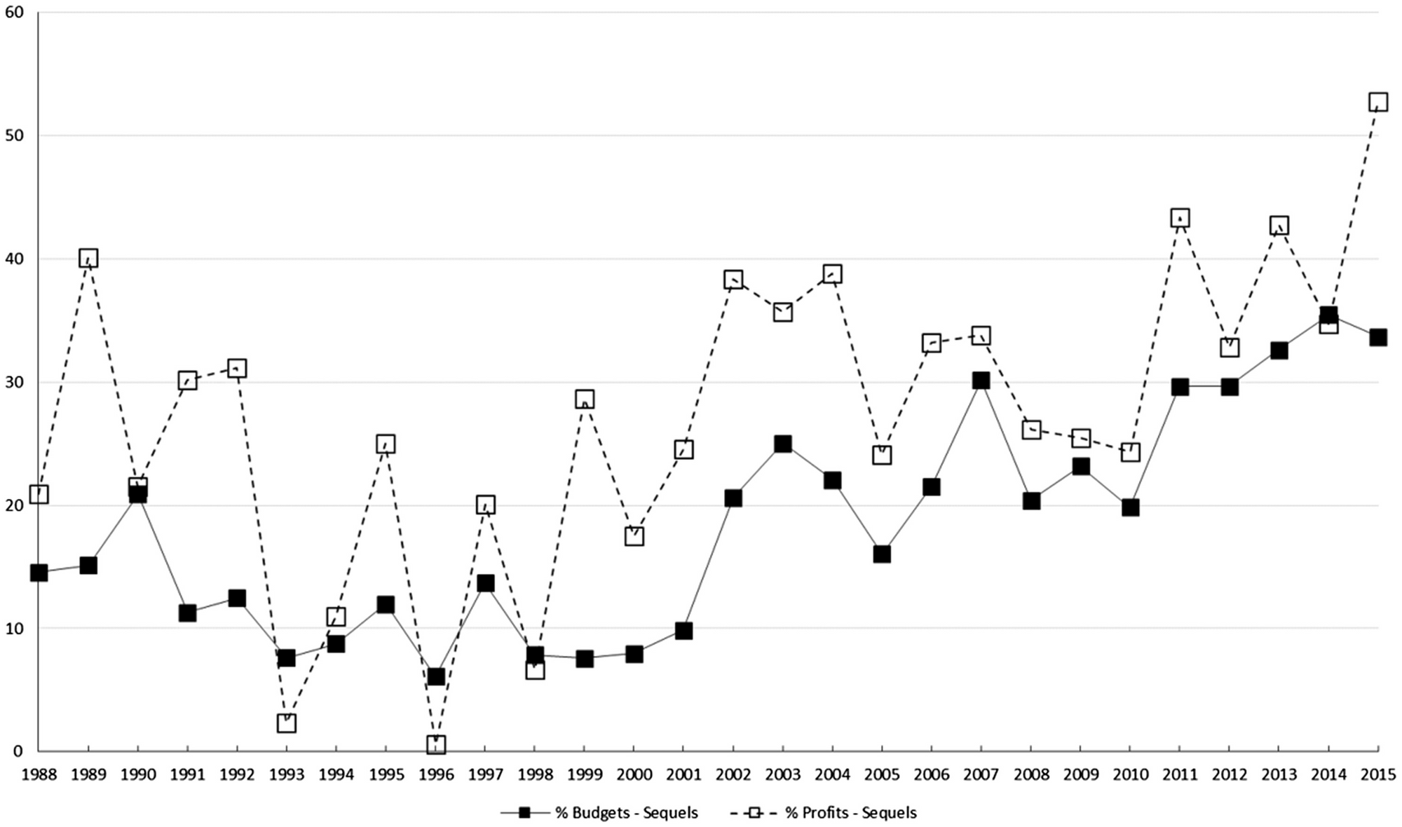 2. 'Managing uncertainty in creative industries: Film sequels and Hollywood’s profitability, 1988–2015', a research article by Michael Pokorny, Peter Miskell and John Sedgwick. The chart below is Figure 4 of the article, showing the percentage of major film studios' production budgets and profits accounted for by sequels.