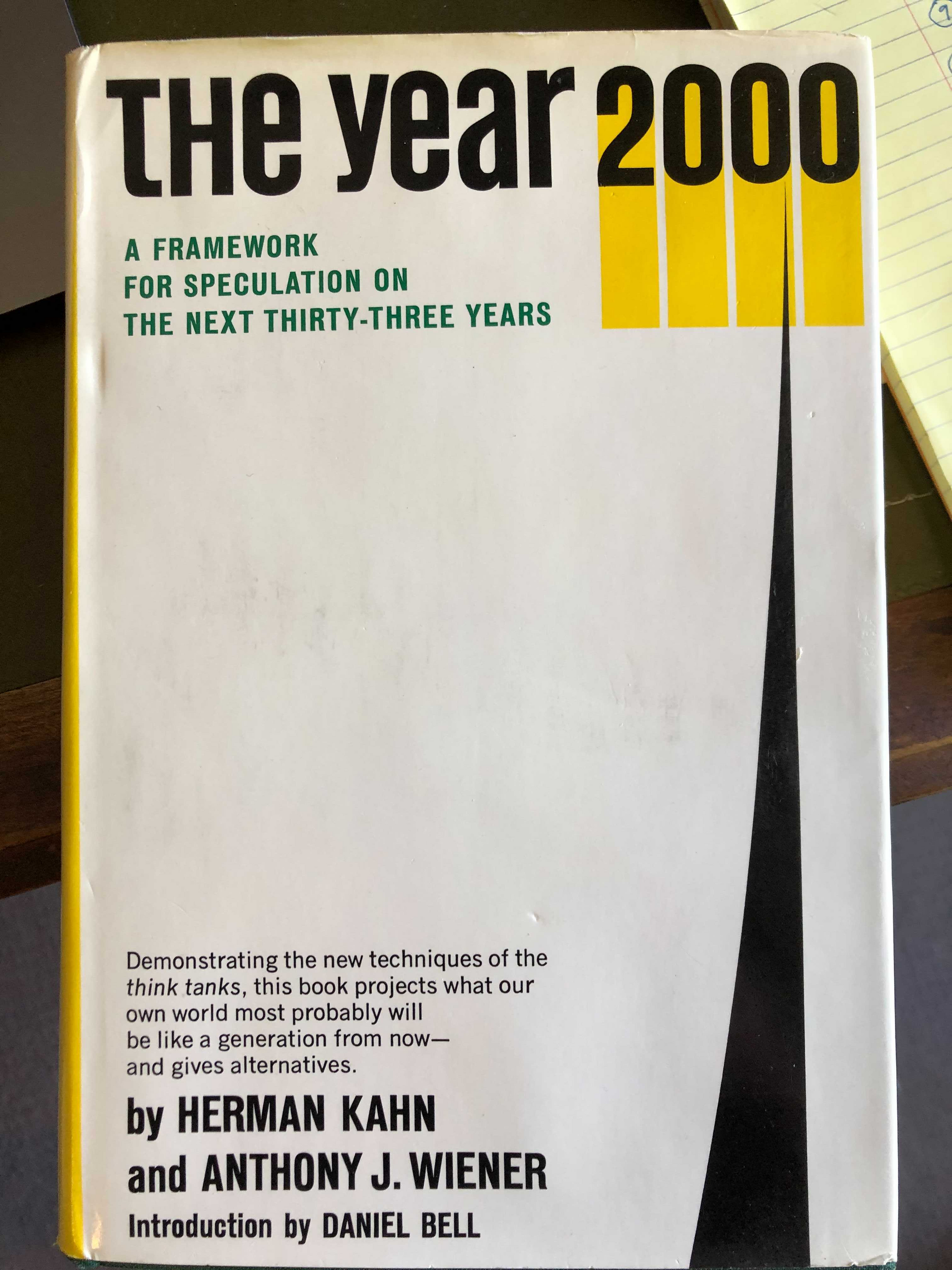 3. This weekend I'm reading The Year 2020: A Framework for Speculation on the Next Thirty-Three Years, by Herman Kahn and Anthony Wiener. Awesome book. It was first published in 1967, and the authors attempt to methodically list all of the technologies that would likely be born by the new millennium. They get most of them wrong, including "individual flying platforms". It's a cool example of how technology is both a cause and consequence of radical uncertainty. I bought a second-hand copy via Amazon. You should be able to find copies there. Photo of the front cover below.
